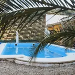 ベッドルーム1室のコルドバ Experience Alpacas In Andaluciaゲストハウス 別荘には、山の景色を望むテラスとプールがあります。